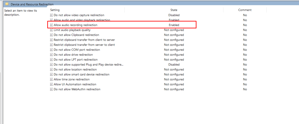 Disable the “Do Not Allow Supported Plug And Play Device Redirection”.