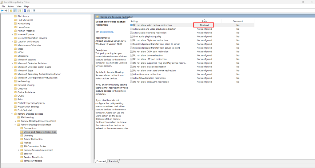 2. Navigate to Computer Configuration → Administrative Templates → Windows Components → Remote Desktop Services → Remote Desktop Session Host → Device and Resource Redirection